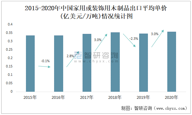 2015-2020年中國家用或裝飾用木制品出口平均單價(億美元/萬噸)情況統(tǒng)計圖
