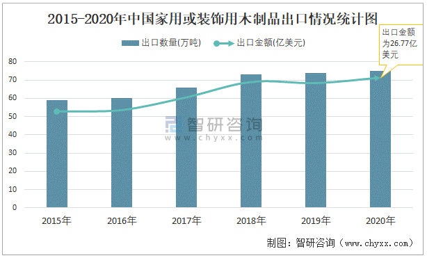 2015-2020年中國家用或裝飾用木制品出口情況統(tǒng)計圖