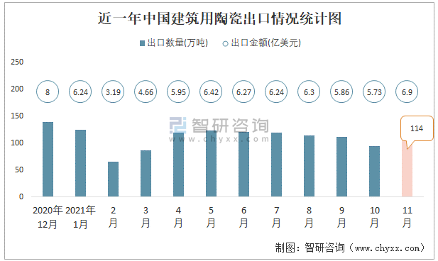 根據中國海關數據顯示:2021年11月中國建筑用陶瓷出口數量為114萬噸,同比下降13.9%,出口金額為6.9億美元,同比增長2.1%;2021年1-11月中國建筑用陶瓷出口數量為1193萬噸,出口金額為63.58億美元。