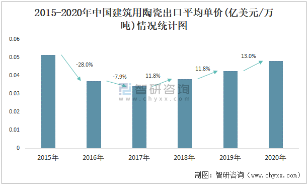 2015-2020年中國建筑用陶瓷出口平均單價(億美元/萬噸)情況統計圖