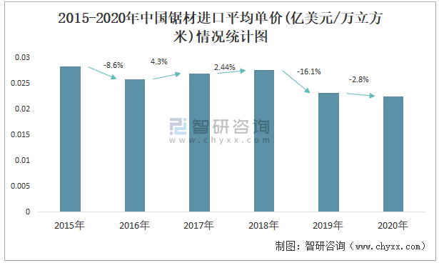 2015-2020年中國鋸材進口平均單價(億美元/萬立方米)情況統計圖