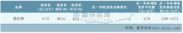 根據農村農業部數據統計可知:2022年第5周全國西紅柿平均批發價為8.75元/公斤,同比增加98.41%,環比增加0.11%,近一年全國西紅柿平均批發價最高達到8.75元/公斤,批發價最低也要2.86元/公斤。