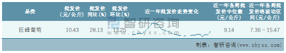 根據(jù)農(nóng)村農(nóng)業(yè)部數(shù)據(jù)統(tǒng)計(jì)可知:2022年第5周全國巨峰葡萄平均批發(fā)價(jià)為10.43元/公斤,同比增加28.13%,環(huán)比增加13.25%,近一年全國巨峰葡萄平均批發(fā)價(jià)最高達(dá)到15.47元/公斤,批發(fā)價(jià)最低也要7.36元/公斤。