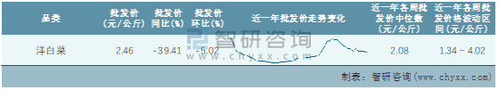 根據農村農業部數據統計可知:2022年第5周全國洋白菜平均批發價為2.46元/公斤,同比下跌39.41%,環比下跌5.02%,近一年全國洋白菜平均批發價最高達到4.02元/公斤,批發價最低也要1.34元/公斤。