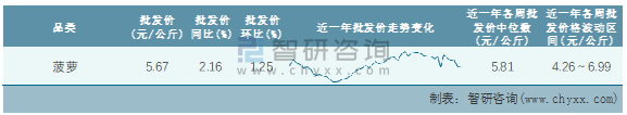 根據農村農業部數據統計可知:2022年第6周全國菠蘿平均批發價為5.67元/公斤,同比增加2.16%,環比增加1.25%,近一年全國菠蘿平均批發價最高達到6.99元/公斤,批發價最低也要4.26元/公斤。