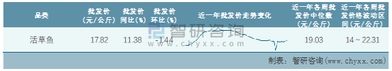 根據農村農業部數據統計可知:2022年第6周全國活草魚平均批發價為17.82元/公斤,同比增加11.38%,環比下跌1.44%,近一年全國活草魚平均批發價最高達到22.31元/公斤,批發價最低也要14元/公斤。