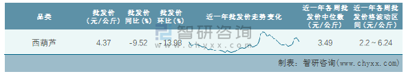 根據農村農業部數據統計可知:2022年第6周全國西葫蘆平均批發價為4.37元/公斤,同比下跌9.52%,環比下跌13.98%,近一年全國西葫蘆平均批發價最高達到6.24元/公斤,批發價最低也要2.2元/公斤。