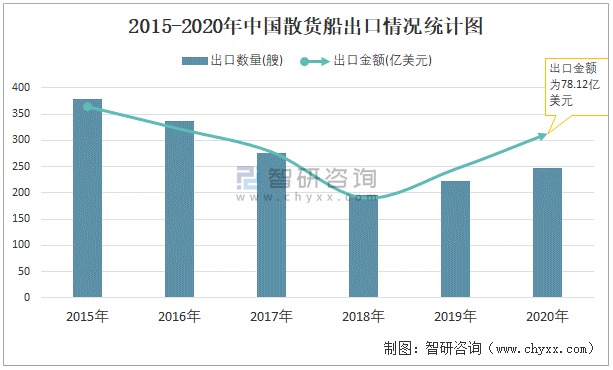 根據中國海關數據顯示:2015-2020年中國散貨船出口數量與出口金額均在2018年跌至最低值,此后逐年遞增;2015-2020年中國散貨船出口平均單價2020年增長速度最快,并達到最大值,而2018年中國散貨船出口平均單價下降速度最快,下滑了2.7%。