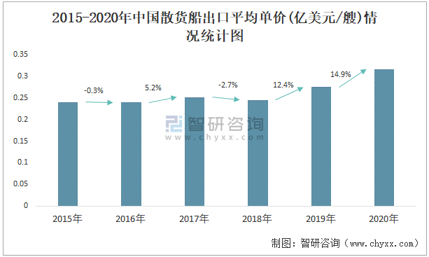 2015-2020年中國散貨船出口平均單價(億美元/艘)情況統計圖