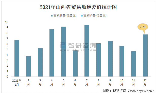 2021年山西省貿易順逆差值統計圖