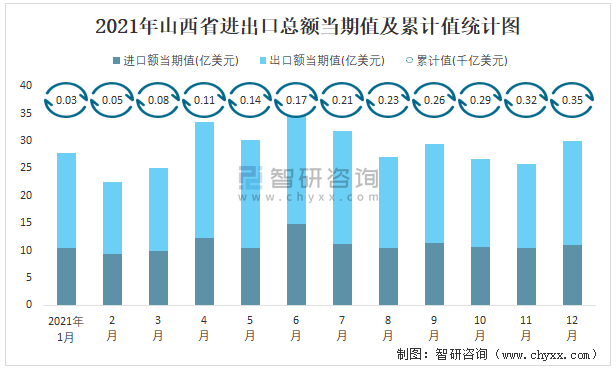 2021年山西省進出口總額當期值及累計值統計圖