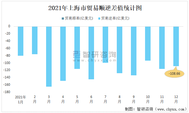 2015-2021年上海市進出口總額及貿易差值統計圖