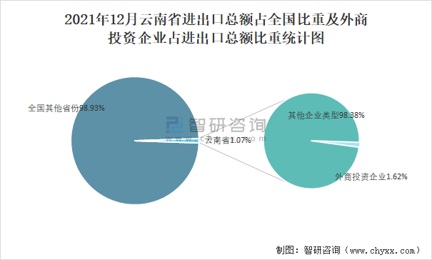2021年12月云南省進出口總額占全國比重及外商投資企業占進出口總額比重統計圖