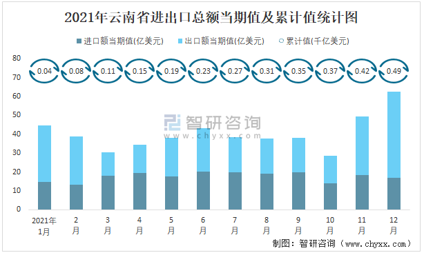 2021年云南省進出口總額當期值及累計值統計圖