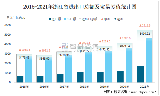 2015-2021年浙江省進出口總額及貿易差值統計圖