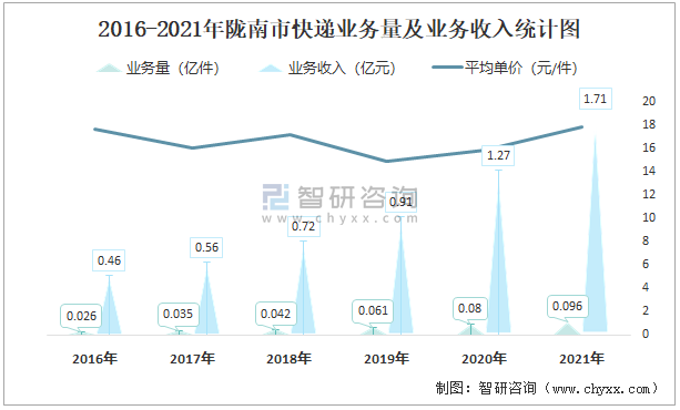 根據各省市郵政局數據可知:2021年12月隴南市快遞業務量為92.63萬件,業務收入為1814.74萬元;2021年1-12月隴南市快遞累計業務量為955.93萬件,同比增長20.19%,累計業務收入為17131.6萬元,同比增長35.01%;2016-2021年隴南市快遞業務量與業務收入逐年遞增,平均單價2019年跌至最低,此后逐年遞增。