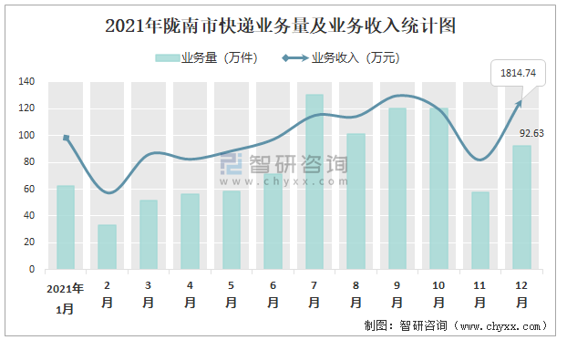 2021年隴南市快遞業務量及業務收入統計圖