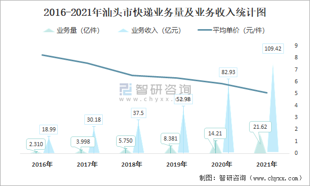 2016-2021年汕頭市快遞業(yè)務量及業(yè)務收入統(tǒng)計圖