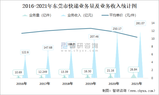 2016-2021年?yáng)|莞市快遞業(yè)務(wù)量及業(yè)務(wù)收入統(tǒng)計(jì)圖