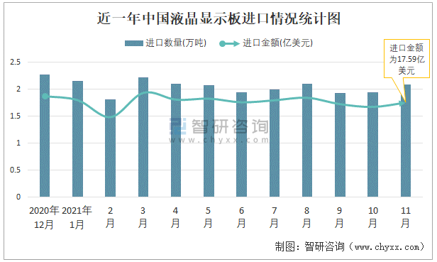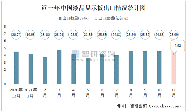 根據中國海關數據顯示:2021年11月中國液晶顯示板進口數量為2.09萬噸,同比下降9.7%,進口金額為17.59億美元,同比下降0.2%,2021年11月中國液晶顯示板出口數量為4.92萬噸,同比增長14%,出口金額為23.99億美元,同比增長25.7%;2021年1-11月中國液晶顯示板進口數量為22.36萬噸,進口金額為194.79億美元,出口數量為47.59萬噸,出口金額為257.09億美元。