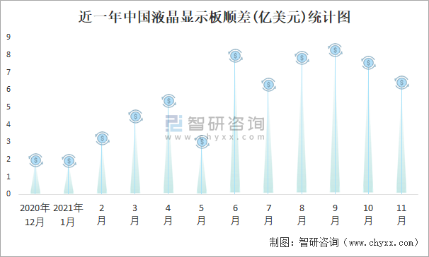 根據中國海關數據顯示:近一年中國液晶顯示板進口金額總體小于出口金額,進出口貿易全部為順差,11差規模有所縮減。