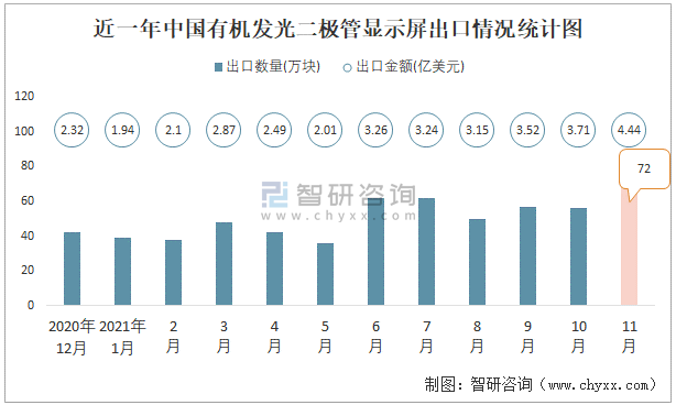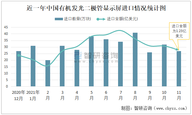 根據(jù)中國海關(guān)數(shù)據(jù)顯示:2021年11月中國有機發(fā)光二極管顯示屏進口數(shù)量為27萬塊,同比增長27.5%,進口金額為1.23億美元,同比增長48.6%,2021年11月中國有機發(fā)光二極管顯示屏出口數(shù)量為72萬塊,同比增長60.9%,出口金額為4.44億美元,同比增長104.6%;2021年1-11月中國有機發(fā)光二極管顯示屏進口數(shù)量為332萬塊,進口金額為14.82億美元,出口數(shù)量為555萬塊,出口金額為32.52億美元。