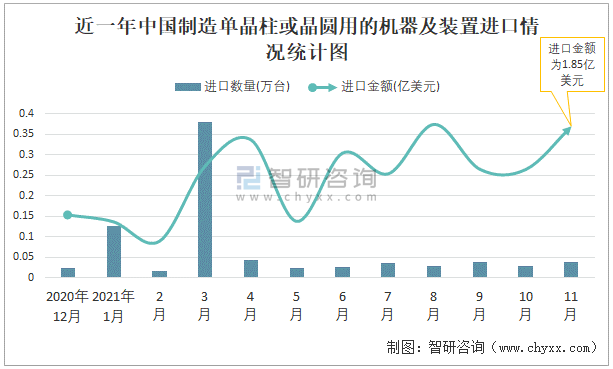 根據(jù)中國(guó)海關(guān)數(shù)據(jù)顯示:2021年11月中國(guó)制造單晶柱或晶圓用的機(jī)器及裝置進(jìn)口數(shù)量為0.04萬(wàn)臺(tái),同比增長(zhǎng)39.4%,進(jìn)口金額為1.85億美元,同比增長(zhǎng)262.9%,2021年1-11月中國(guó)制造單晶柱或晶圓用的機(jī)器及裝置進(jìn)口數(shù)量為0.36萬(wàn)臺(tái),進(jìn)口金額為14.07億美元。
