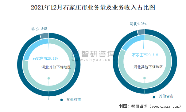 根據各省市郵政局數據可知:2021年12月石家莊市快遞業務量占河北快遞業務量的28.22%,河北快遞業務量占全國快遞業務量的4.84%;2021年12月石家莊市快遞業務收入占河北快遞業務收入的20.71%,河北快遞業務收入占全國快遞業務收入的4.05%。