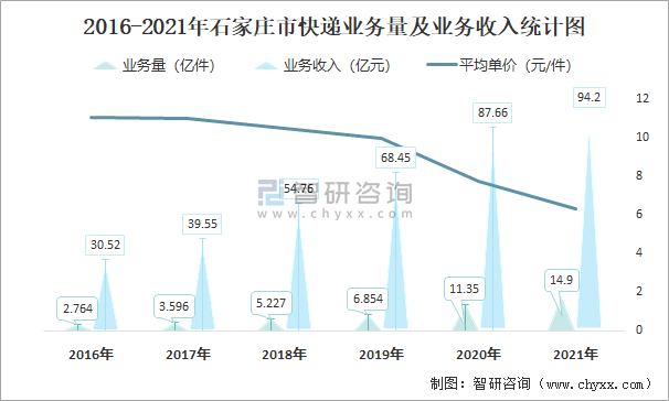 2016-2021年石家莊市快遞業務量及業務收入統計圖