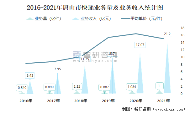 2016-2021年唐山市快遞業務量及業務收入統計圖