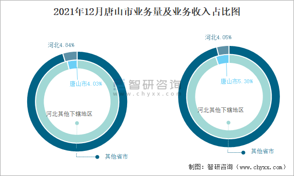 根據各省市郵政局數據可知:2021年12月唐山市快遞業務量占河北快遞業務量的4.03%,河北快遞業務量占全國快遞業務量的4.84%;2021年12月唐山市快遞業務收入占河北快遞業務收入的5.38%,河北快遞業務收入占全國快遞業務收入的4.05%。