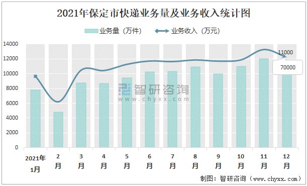 2021年保定市快遞業(yè)務(wù)量及業(yè)務(wù)收入統(tǒng)計(jì)圖