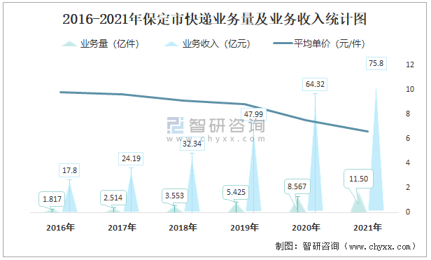2016-2021年保定市快遞業(yè)務(wù)量及業(yè)務(wù)收入統(tǒng)計(jì)圖