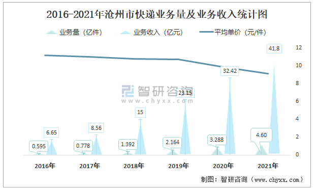 根據各省市郵政局數據可知:2021年12月滄州市快遞業務量為4522.46萬件,業務收入為37700萬元;2021年1-12月滄州市快遞累計業務量為46000萬件,同比增長40.1%,累計業務收入為418000萬元,同比增長28.9%;2016-2021年滄州市快遞業務量與業務收入均逐年遞增,平均單價總體呈現下降趨勢。