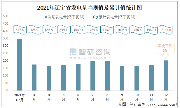 2021年遼寧省發(fā)電量當期值及累計值統(tǒng)計圖