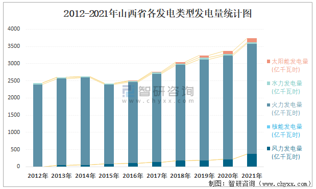 2012-2021年山西省各發電類型發電量統計圖