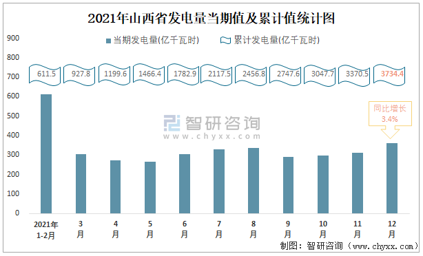 2021年山西省發電量當期值及累計值統計圖