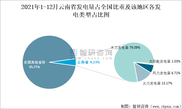 2021年1-12月云南省發電量占全國比重及該地區各發電類型占比圖