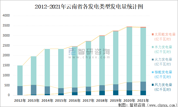 2012-2021年云南省各發電類型發電量統計圖