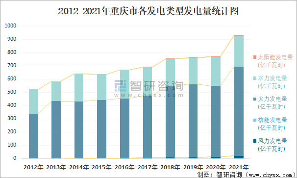 2012-2021年重慶市各發電類型發電量統計圖