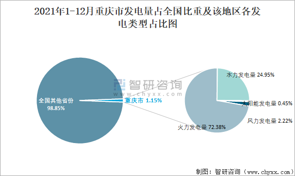 2021年1-12月重慶市發電量占全國比重及該地區各發電類型占比圖