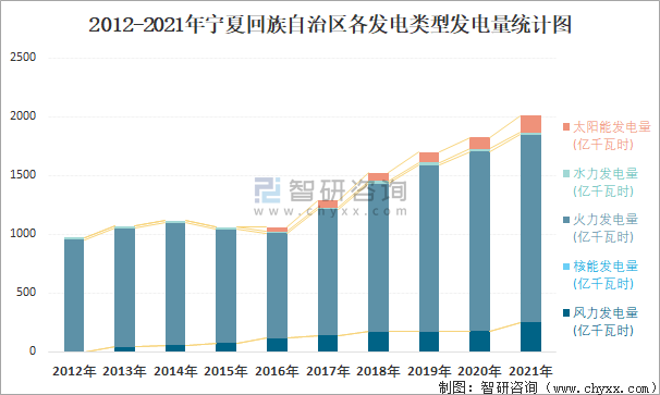 2012-2021年寧夏回族自治區各發電類型發電量統計圖