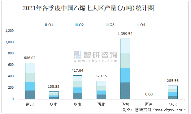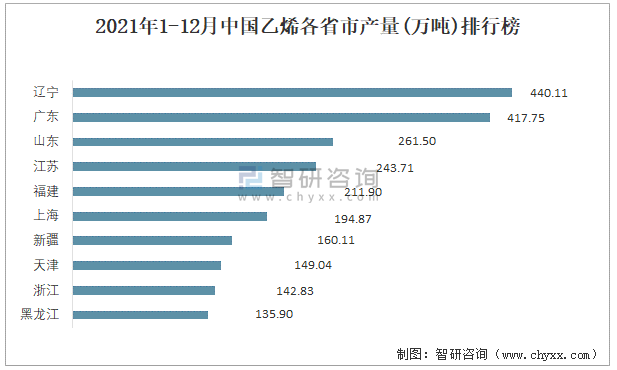 根據國家統計局數據顯示:2021年各季度中國乙烯主要集中在華東、東北、華南地區生產;2021年1-12月中國乙烯產量大區分布不均衡,其中華東地區產量最高,特別是山東省貢獻了最多產量;2021年1-12月中國乙烯各省市產量中遼寧和廣東兩省產量領先于其他省份。