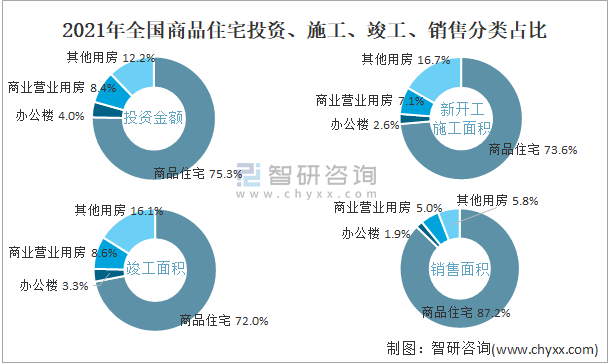 根據國家統計局數據統計可知:2021年全國房地產開發企業在商品住宅中投資金額占比為75.3%,商品住宅的新開工面積與竣工面積所占比重差異不大,從銷售面積來看,商品住宅為銷售主力(占比高達87.2%),辦公樓銷售面積占比少于商業營業用房銷售面積占比。