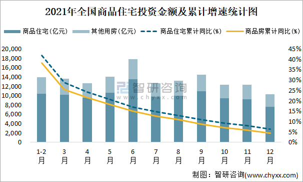 根據國家統計局數據統計可知:2021年12月全國房地產開發投資商品房投資金額為10288.12億元(其中商品住宅為7585.52億元,辦公樓、商業營業用房等其他用房2702.6億元);2021年全國房地產開發投資商品住宅累計投資金額為111173億元,投資金額累計同比增長6.4%。