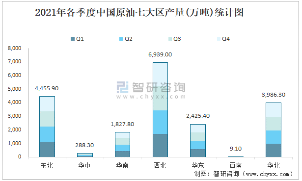 2021年各季度中國原油七大區產量統計圖