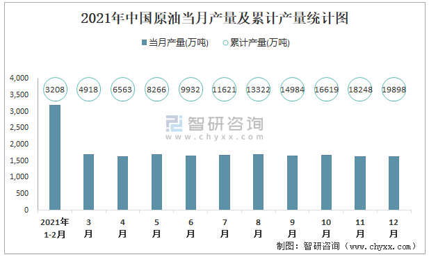 2021年中國原油當月產量及累計產量統計圖
