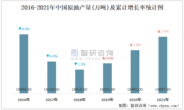 根據國家統計局數據顯示:2021年12月中國原油產量為1647萬噸,同比增長1.7%;2021年1-12月中國原油累計產量為19897.6萬噸,累計增長2.4%;2016-2021年中國原油產量量2018年跌至最低,此后逐年遞增。