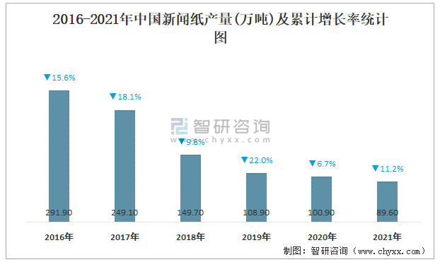 2016-2021年中國新聞紙產量及累計增長率統計圖