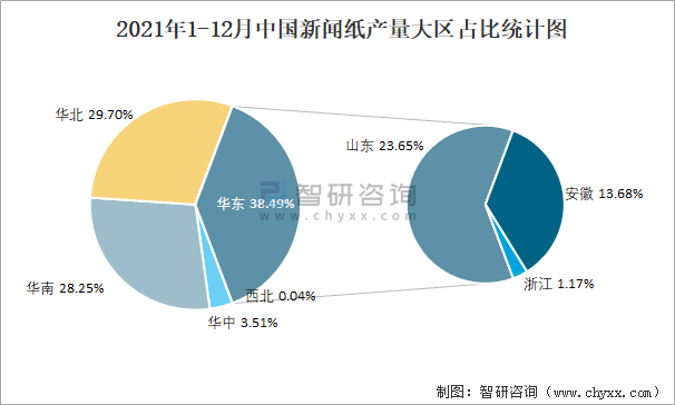 2021年1-12月中國新聞紙產量大區占比統計圖